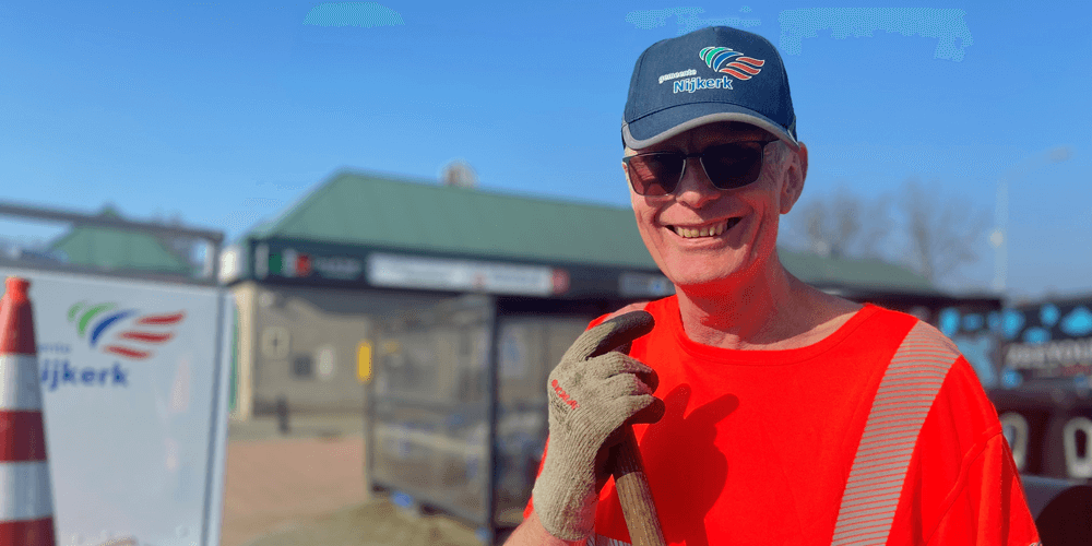 Dit is Alex Nahuys. Begon ooit op zijn 17e in de groenvoorzienig en werkt inmiddels al 26 jaar bij de afdeling Dagelijks Beheer in gemeente Nijkerk. Omdat het de Week van de Afvalhelden is, mocht hij vandaag wethouder René Windhouwer aan het werk zetten.